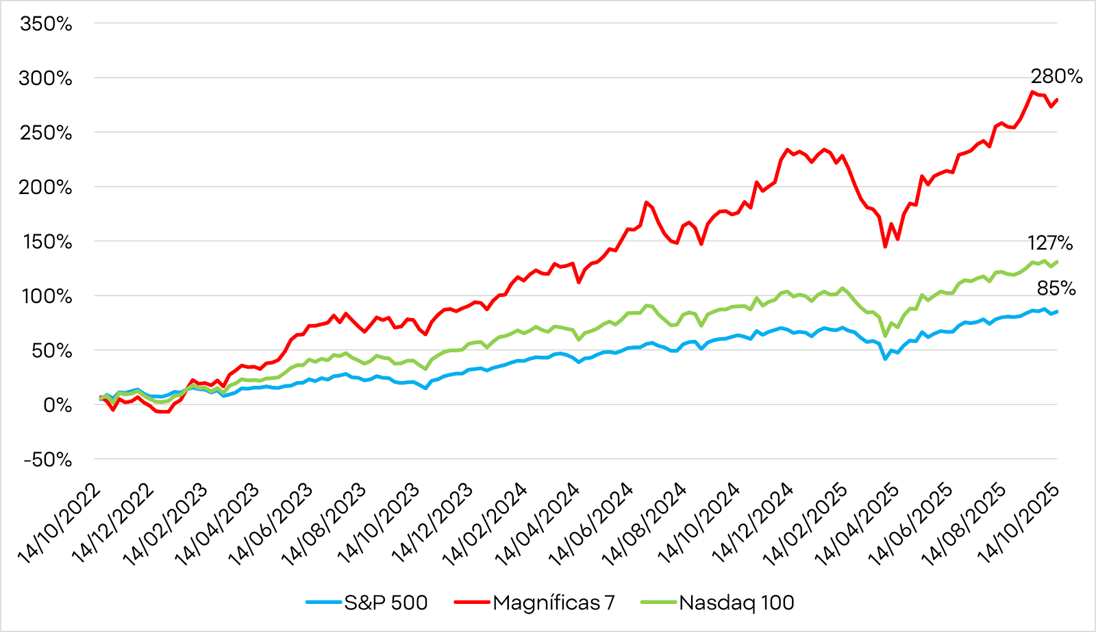 - Trí tuệ nhân tạo đang thúc đẩy đợt tăng giá mạnh nhất kể từ năm 2022, với S&P 500 tăng 85% và “Bảy gã khổng lồ” (Magnificent 7) vọt lên 280%.