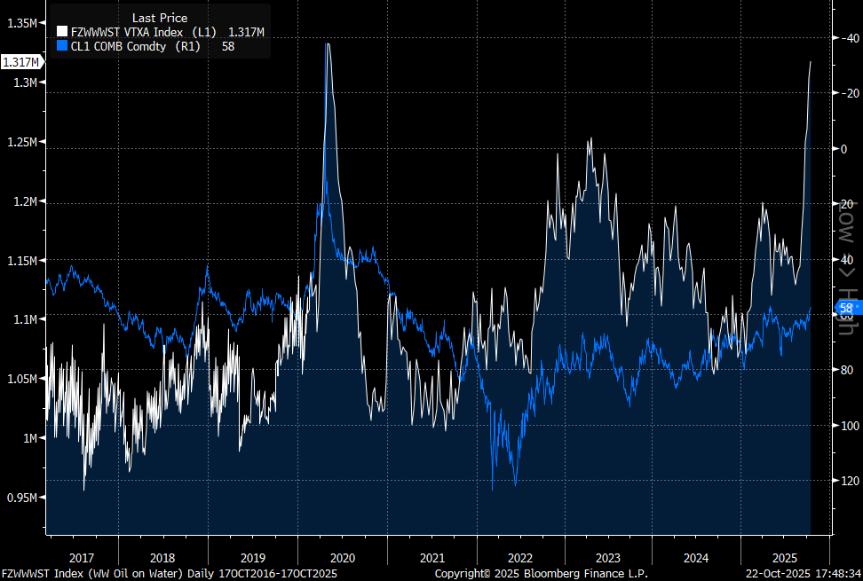 Lượng dầu trên biển hiện đang ở mức cao nhất kể từ năm 2020, cho thấy tình trạng dư cung dai dẳng và nghiêm trọng. Nguồn: Bloomberg Finance LP, XTB