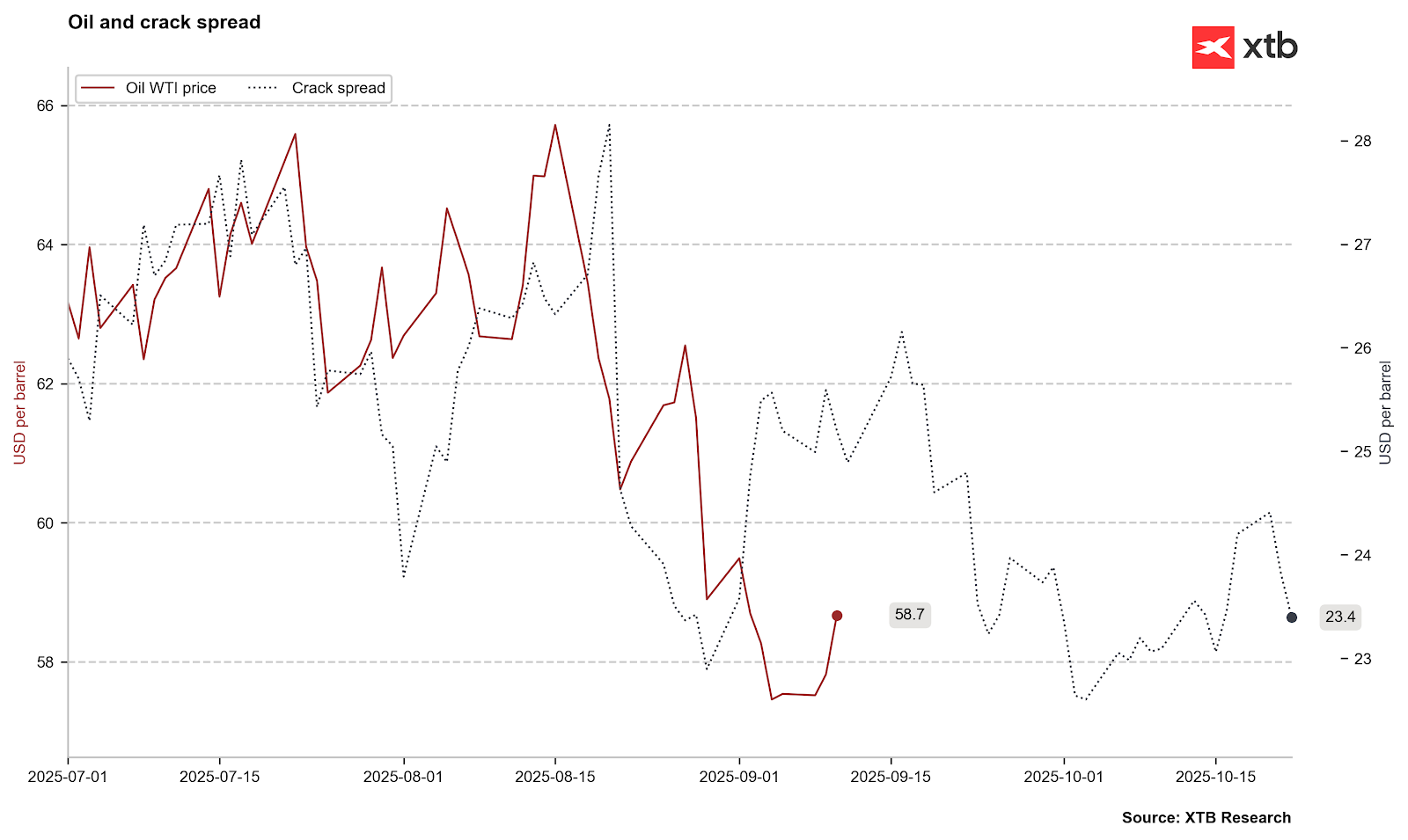 The crack spread suggests no excessive demand rebound should be expected in the US over the next month. Source: Bloomberg Finance LP, XTB